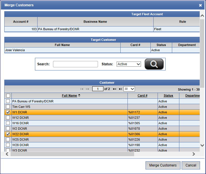 - Click to select one or more Customer boxes to merge with the Target Customer.