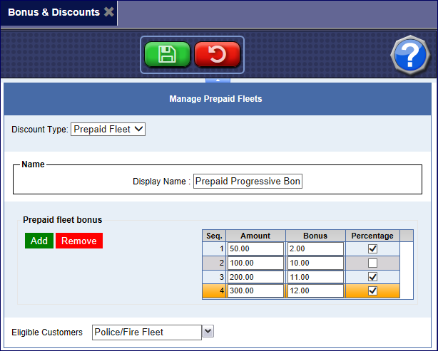 NOTE: This feature is only available to Prepaid Fleet Accounts, and Users must be in a Security Role with Bonus and Discounts privilege selected.