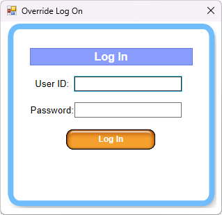 - If you Logged in as the Default User and then clicked on an item that requires a User ID other than the Default User ID, the Override Log On dialog will appear.