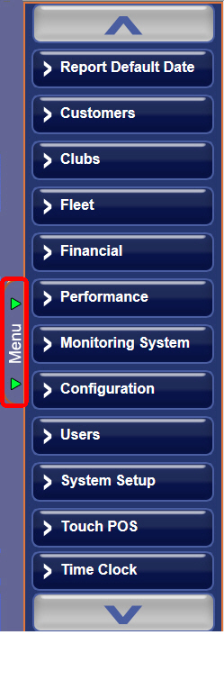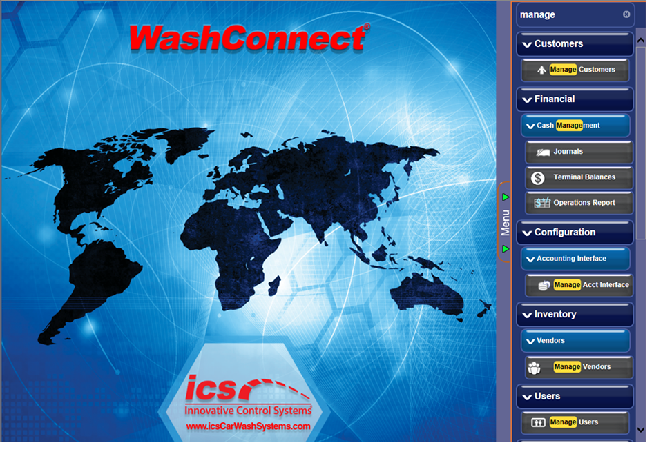 The Menu displays the items that are available for the User who is currently logged into WashConnect. The Menu may include daily tasks that manage customers, vehicles, fleets, and employees. Reporting items to monitor the status of your wash, and configuration items to make changes to the way the wash operates. A POS or Presell terminal to sell services to customers, and a Stack Management screen to manipulate your tunnel queue, or any combination of these menu items. The available menu items may change depending upon which user is currently logged in to WashConnect since each user is individually assigned personal access privileges to the menu items to fully control user menu accessibility based on their logon level and security roles.