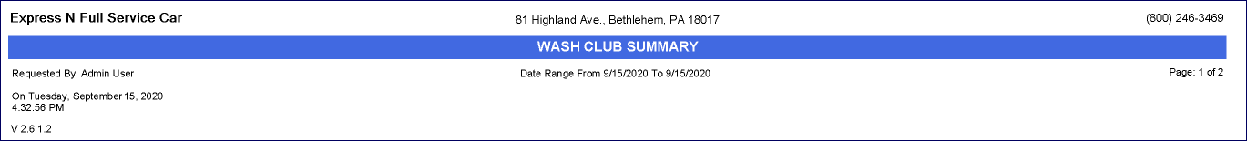 - Your Car Wash name, address, and phone number appear above the report Title Bar.