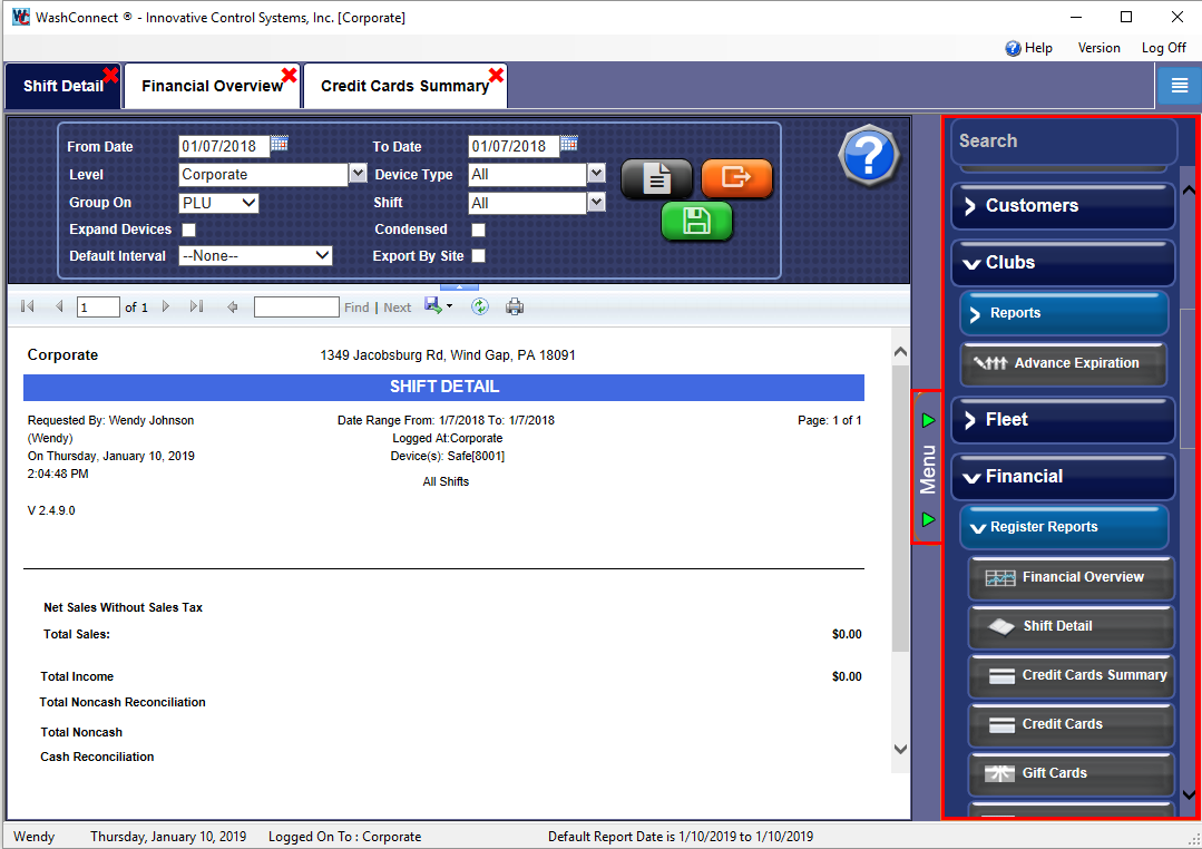 Extra screen width is available for your reports if you click the Menu tab to hide the menu bar.