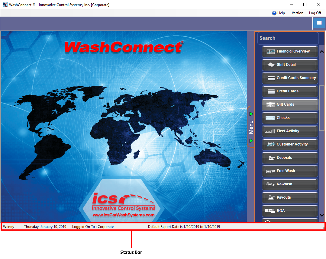 - Logged On To: The level selected when logging into WashConnect. Depending upon the created Corporate structure, the level may be the corporate location, a sales region, a state, a city, or an individual car wash site.
