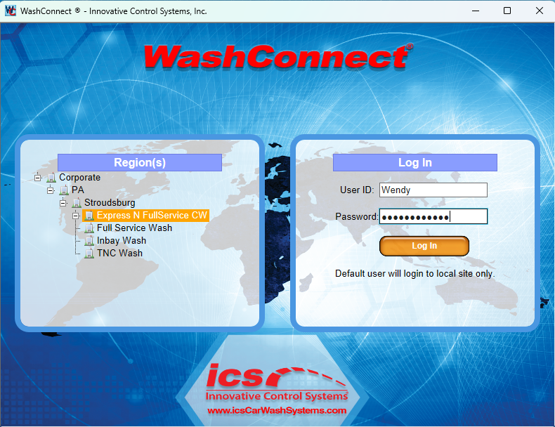 The selected Region and the entered user ID defines which menu buttons, data, and reports that the User has access to after log on. When logging on at a Site level, only that site data is available for viewing while the menu items that are only available at Corporate are hidden. Any configuration done at the Site level will be specific to that site, but will also be pushed up through the structure until it reaches Corporate. When logging on at the Corporate level, the data from all sites will be available for viewing and all of the Corporate only menu items may be accessible, depending on the user’s security role permissions. If your sites use corporate created wash services, they may be created at Corporate and pushed down through the Regions to the individual Sites.