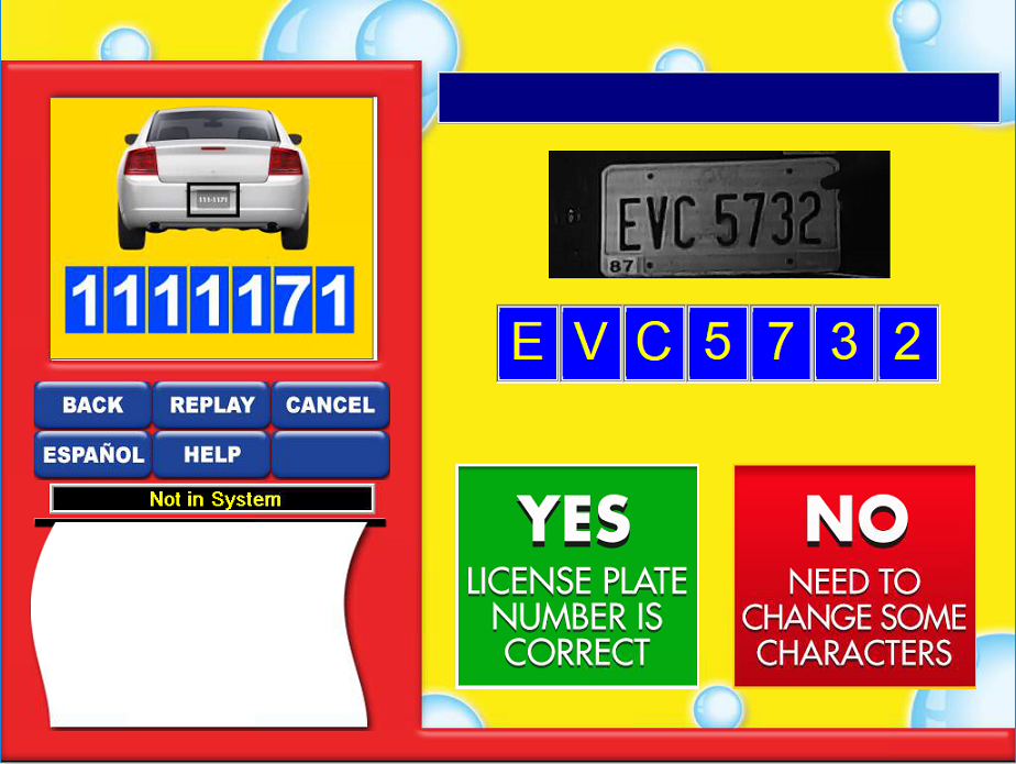 If the customer’s license plate number is not a valid number in the system, the message License Plate is Not in Database appears, and they will need to purchase a wash or club membership.