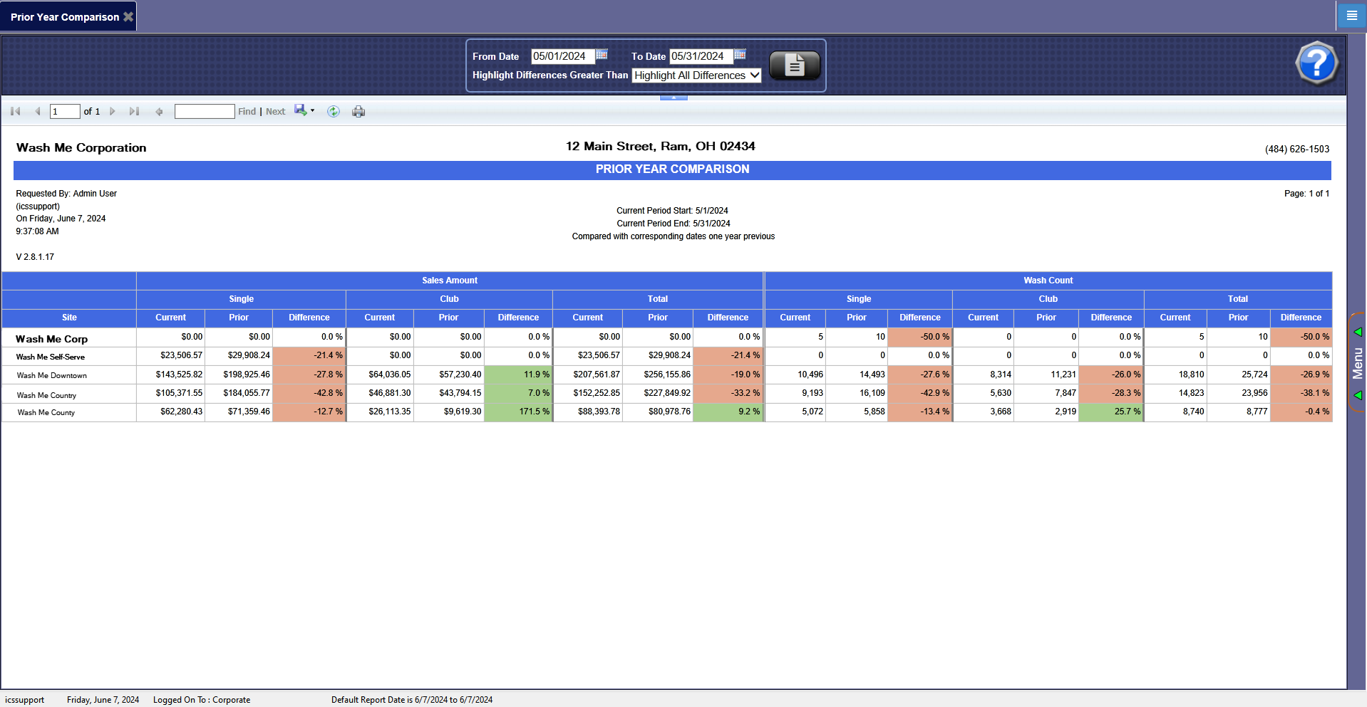 NOTE: When logged in at the Corporate location, the entire Corporate structure will be available. When logged in at a site level, only that site will be available for selection.
