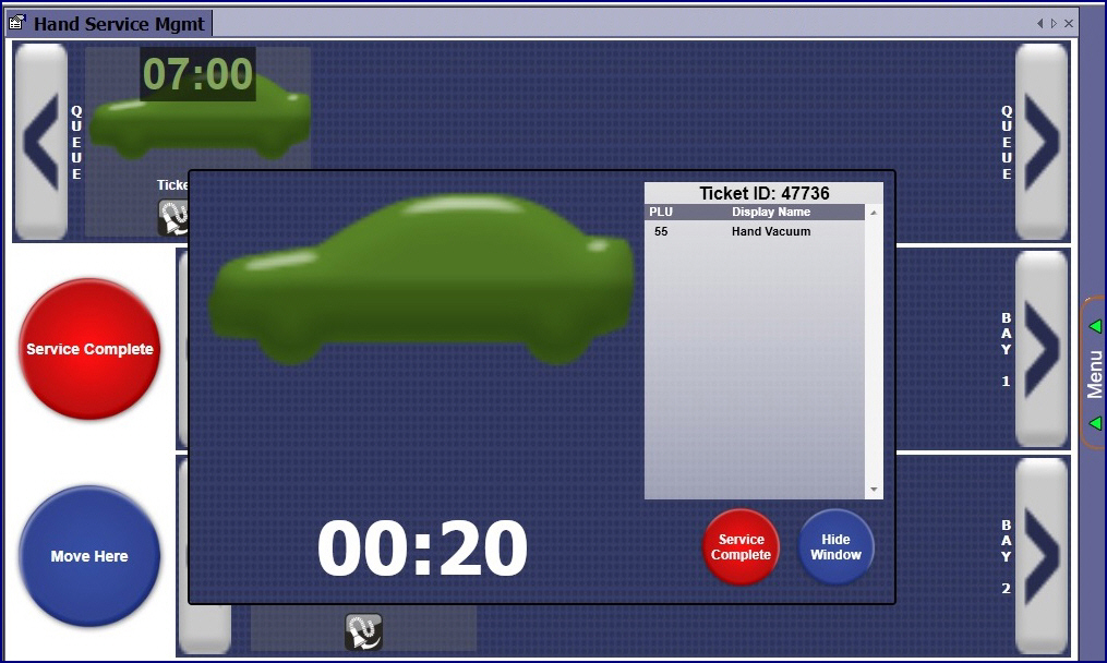The pop-up window appears displaying the wash ticket number and the amount of time it has been in the queue or InBay.