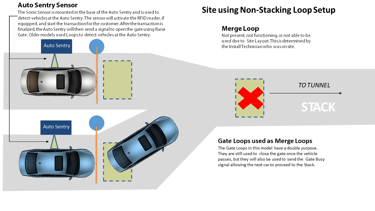 In a Non-Stacking Loop setup, the Merge Loop is not hooked up or does not exist all together. We would need to use the Gate Loops as the Merge Loops. The ICS gates have the ability to send a second signal back to the Auto Sentry to use as a Gate Busy.