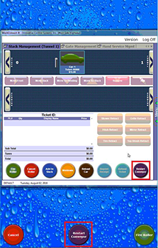 The Idle Conveyor/Restart Conveyor buttons are used to prevent putting the system into a full Panic state. These buttons are displayed on the Touch Entrance Sign and on the Stack Management screen in WashConnect and communicate with the tunnel controller, the Tunnel Master WBC.