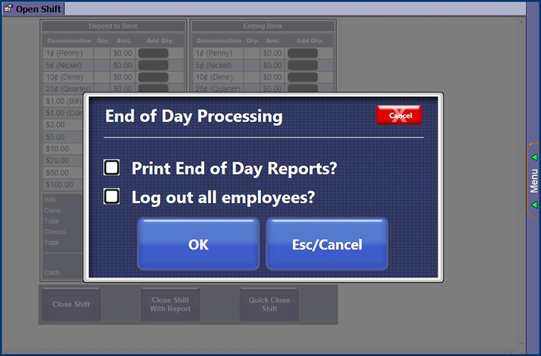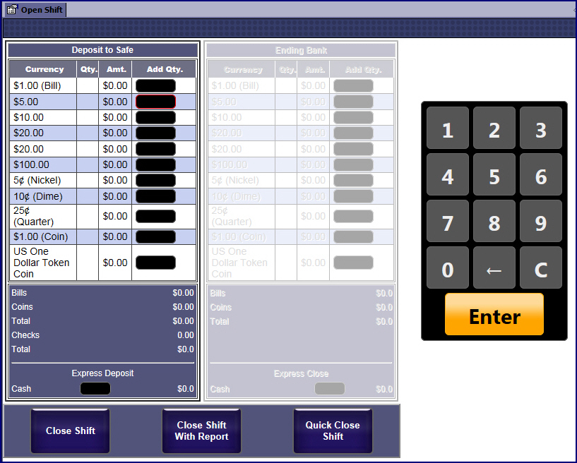 NOTE: The Quick Close Shift option is only available for use if you do not enter any quantities in the denomination section.