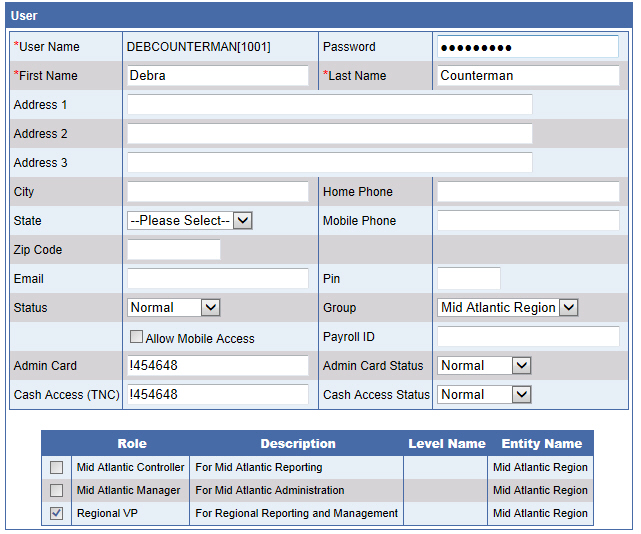 In this illustration, DEBCOUNTERMAN[1001] is assigned to Regional VP role from the Mid Atlantic Region group.
