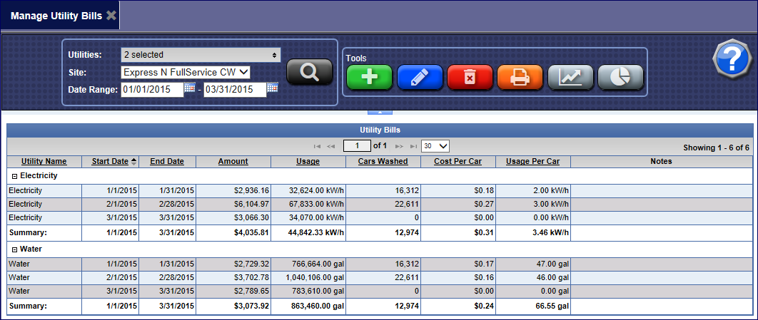 Manage Utility Bills will list all existing bills entered into the system. Search by Utilities, Site, and Date Range. The Vehicle Statistical Performance Report data will be referenced in order to determine the cost per car and usage per car for the utility. Calculations are not performed when a bill is saved.